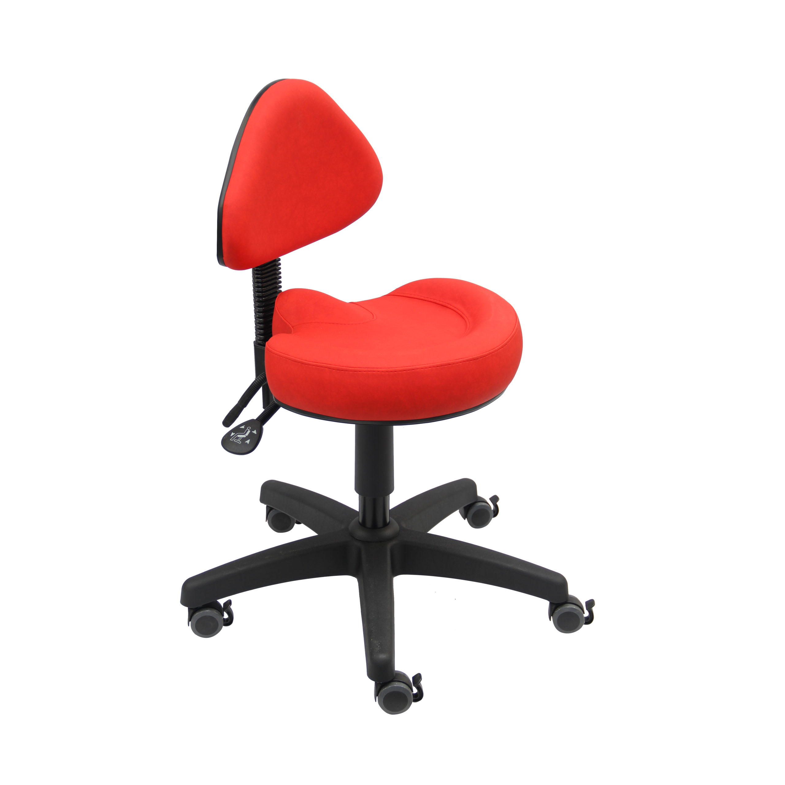 Assise et soutien ventral équipés d’un mécanisme asynchrone permettant le réglage indépendant de l’angle de l’assise (+(5°/-6°) et de l’angle du soutien ventral oblong (+10°/-18°) EN-1335 avec blocage en toute position suivant l’utilisateur, permettant une posture assis debout confortable et ergonomique. Soutien ventral anatomique oscillant réglable en hauteur et inclinaison.